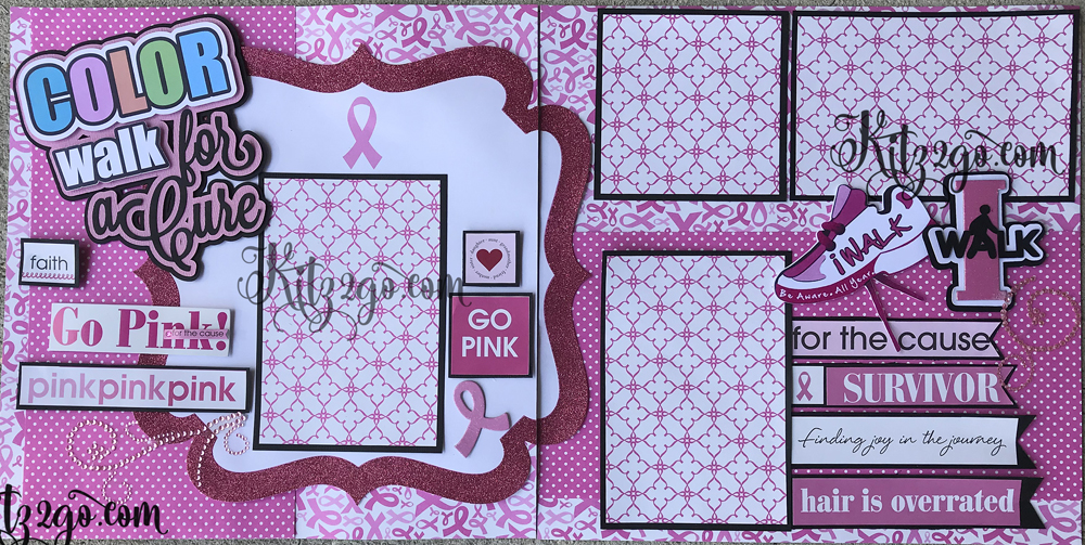 Kit Contents: 5 papers, 1 specialty die cut paper, 5 piece die cut title, 1 sheet of stickers, 3 pieces of printed chipboard, die cut shoe, die cut “I Walk”, 2 piece background for ‘I Walk”, Rhinestone swirl.